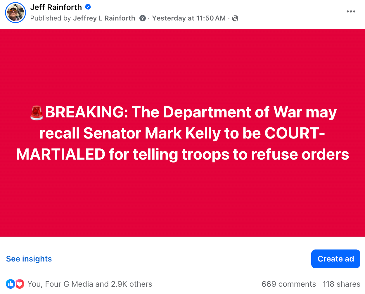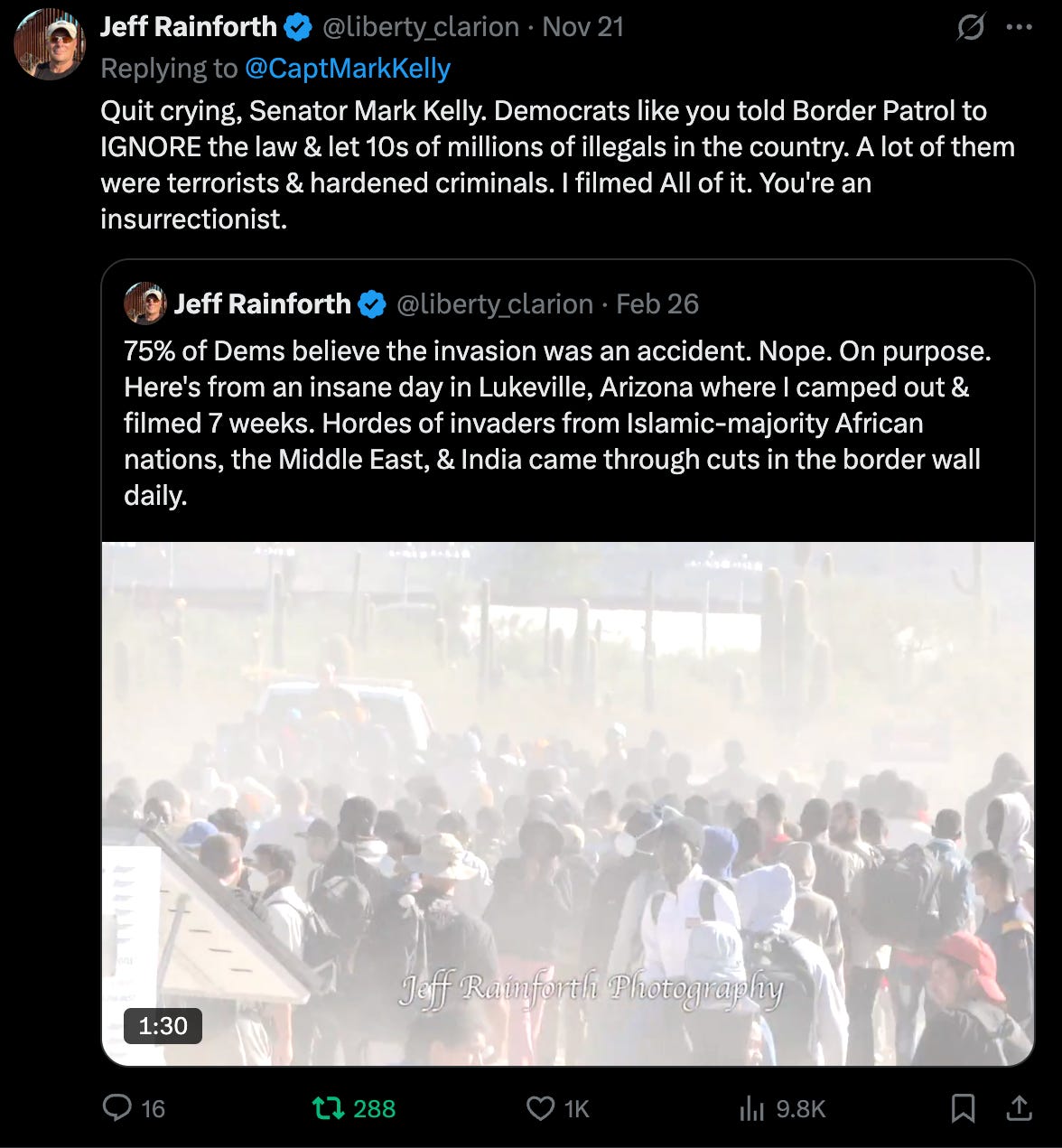 “Quit crying, Senator Mark Kelly. Democrats like you told Border Patrol to IGNORE the law & let 10s of millions of illegals in the country. A lot of them were terrorists & hardened criminals. I filmed All of it. You’re an insurrectionist.”